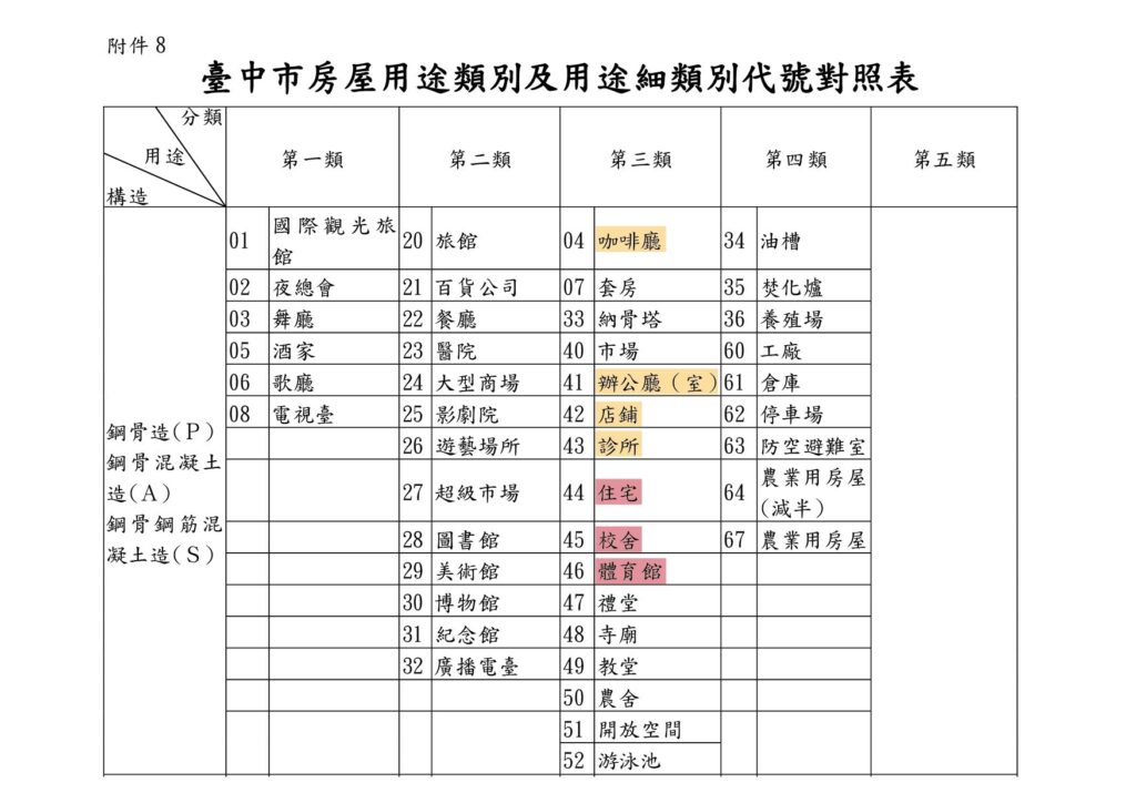 ;根據「台中市30層以下房屋標準單價表」,以鋼骨造住宅為例屬於第三類,單價從4400元起,但第四類的工廠等竟然是3340元,而住宅甚至是跟學校、體育館等可以有收入的機構保持一樣的標準!不只是鋼骨造,連加強磚造住宅都比工廠多了700元,每年坪數這樣換算,對民眾而言是不小的數目;好奇地稅局是以什麼做爲分類依據? 單價表中的第五類又是什麼?