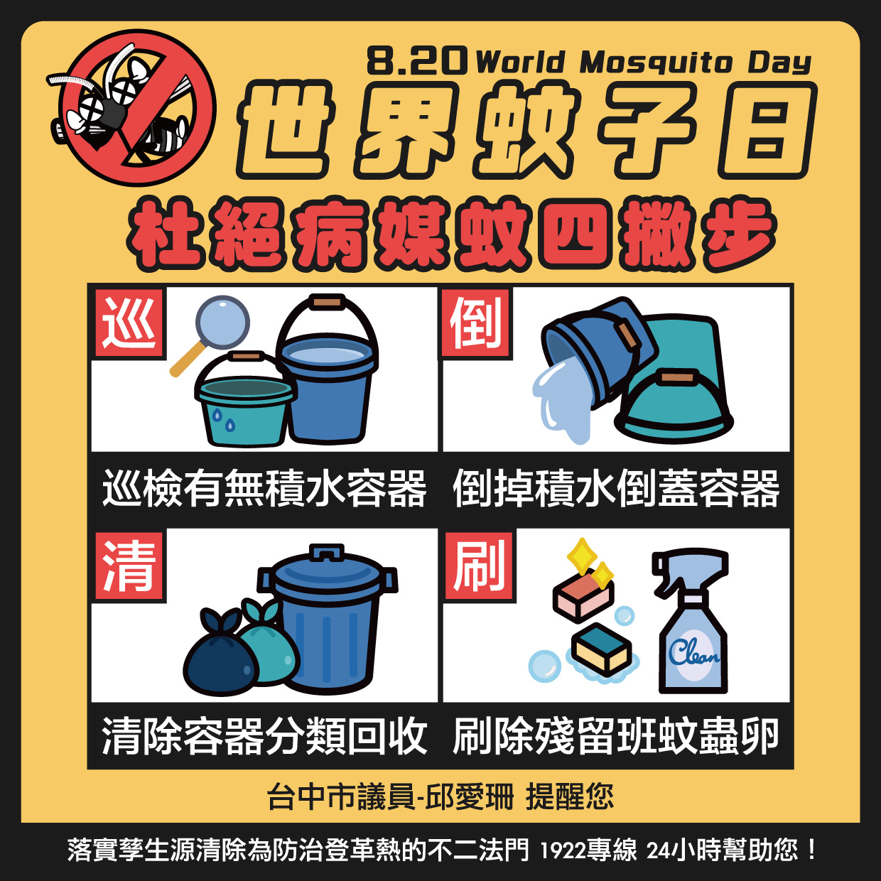 防治登革熱四撇步「巡、倒、清、刷」要記起來喔🤓