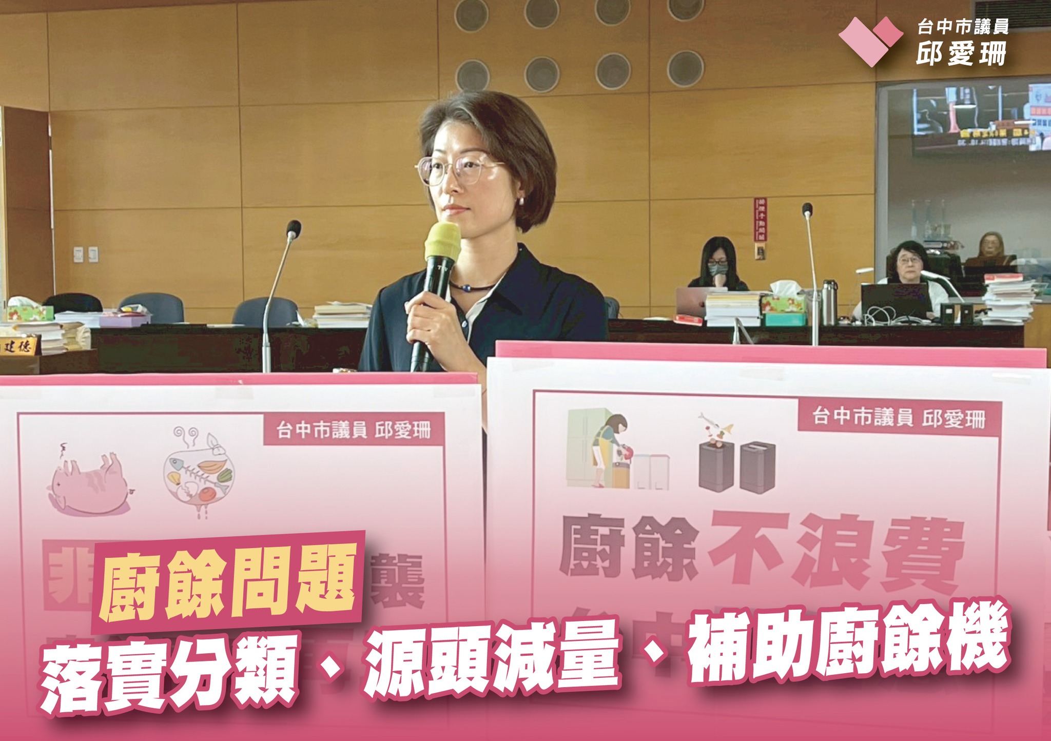 在上一個會期,愛珊於議會提案並質詢環保局長,建議台中市研議推動「廚餘機補助辦法」: