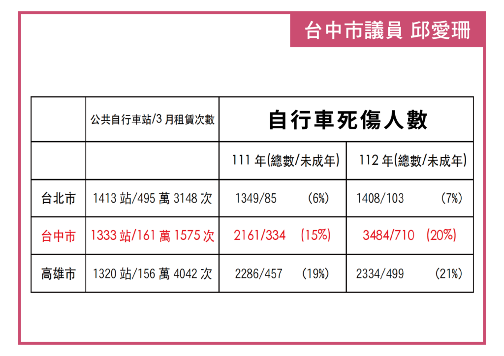 ;據統計資料,台中市未成年騎乘自行車死傷事故從111年的334件,攀升至112年的710件,與台北及高雄相比兩年內成長5%,顯然不是一個好的數據,同時凸顯出台中市在安全路網規劃中,對於自行車族群的行車安全問題是需要檢討與改善的!