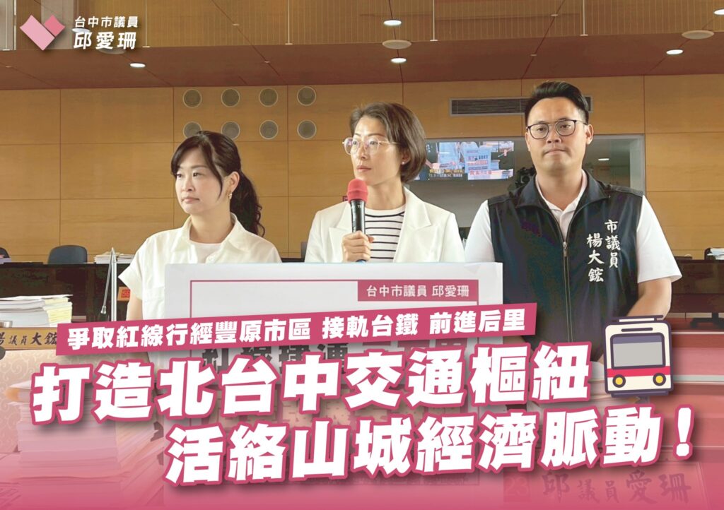 愛珊多次在議會提案、質詢,主張捷運紅線應該進入「豐原市區」、銜接「台鐵豐原站」,讓捷運深入人口稠密的商業區,才能有效活絡地方發展,發揮公共運輸效益;若捷運只從外圍繞過舊市區,將錯失最核心的乘載效益,變成「低效」捷運線;而且捷運紅線也不該止步於豐原,更應延伸至「#后里」,讓整個山城共榮發展![]()