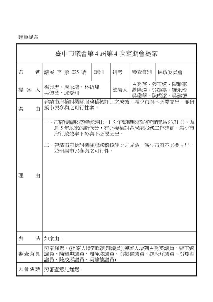 愛珊在議會-提案📄「建請市府檢討機關服務稽核評比之成效,減少市府不必要支出,並研擬市民參與之可行性案。」