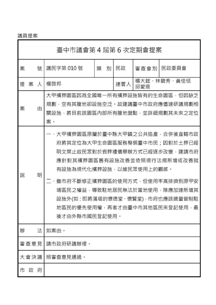 愛珊在議會-提案📄大甲殯葬園區因爲全國唯一所有殯葬設施皆有的生命園區,但因缺乏規劃,空有其腹地卻設施空泛。故建議臺中市政府應儘速研議規劃相關設施,將目前該園區內部所有腹地盤點,並詳細規劃其未來之定位案。