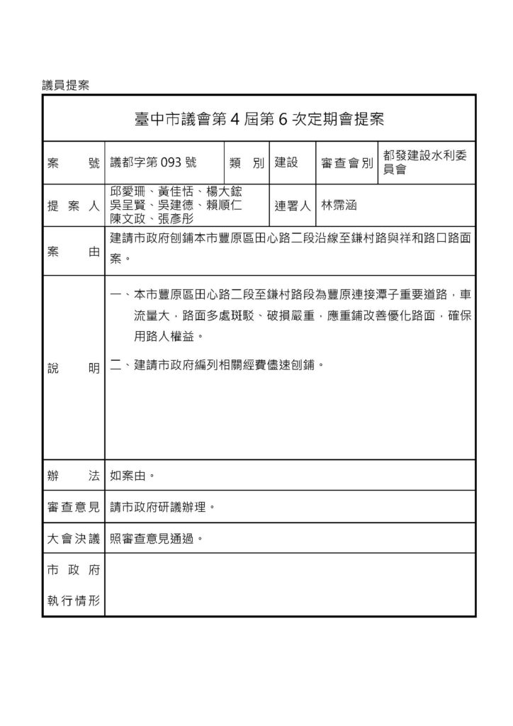 愛珊在議會-提案📄建請市政府创鋪本市豐原區田心路二段沿線至鎌村路與祥和路口路面案。