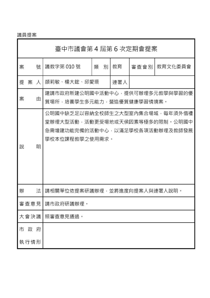 愛珊在議會-提案📄建請市政府新建公明國中活動中心,提供可辦埋多元教學與學習的優質場所,培養學生多元能力,營造優質健康學習情境案。