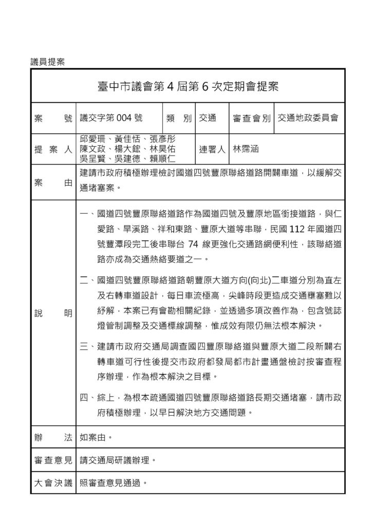 愛珊在議會-提案📄建請市政府積極辦埋檢討國道四號豐原聯絡道路開闢車道,以緩解交通堵塞案。