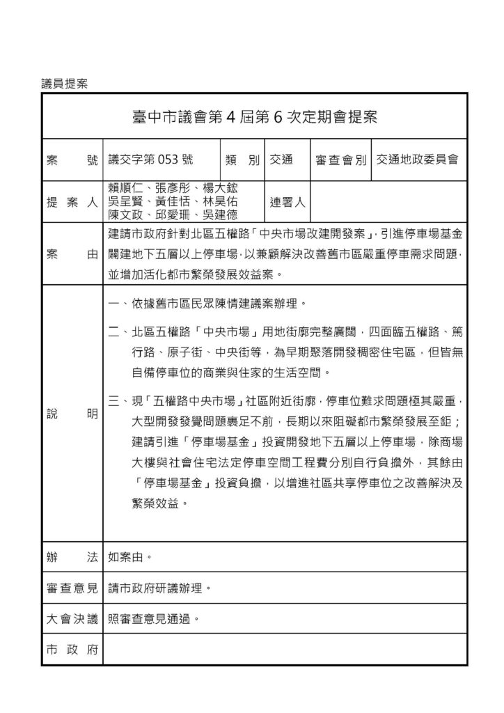 愛珊在議會-提案📄建請市政府針對北區五權路「中央市場改建開發案」,引進停車場基金闢建地下五層以上停車場,以兼顧解決改善舊市區嚴重停車需求問題,並增加活化都市繁榮發展效益案。