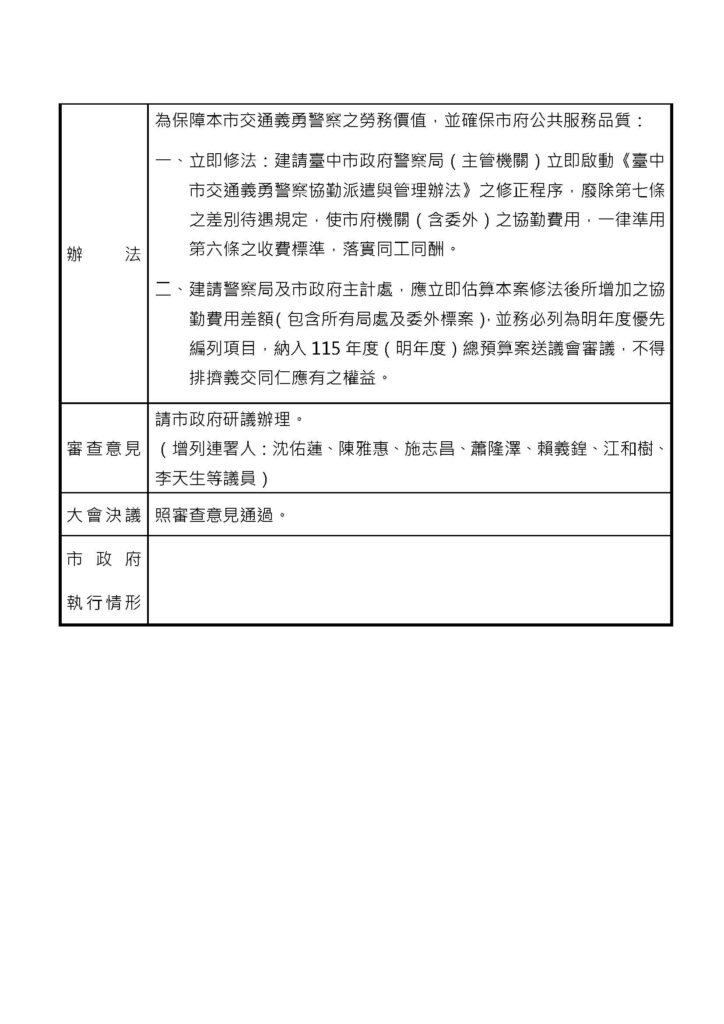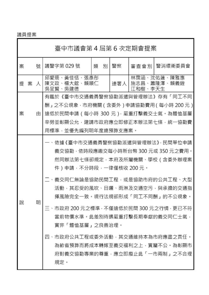 愛珊在議會-提案📄有鑑於《臺中市交通義勇警察協勤派遣與管埋辦法》存有「同工不同酬」之不公現象,市府機關(含委外)申請協勤費用(每小時200元)遠低於民間申請(每小時300元),嚴重打擊義交士氣。為體恤基層辛勞並彰顯公允,建請市政府應立即修正本辦法第七條,統一協勤費用標準,並優先編列明年度總預算支應案。