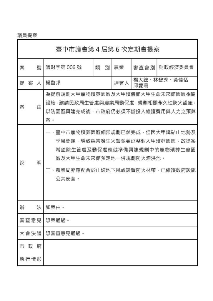 愛珊在議會-提案📄為提前規劃大甲寵物殯葬園區及大甲殯儀館大甲生命未來館園區相關設施•建請民政局生管處與農業局動保處,規劃相關永久性防火設施,以防園區興建完成後,市政府仍必須不斷投入維護費用與人力之預算案。