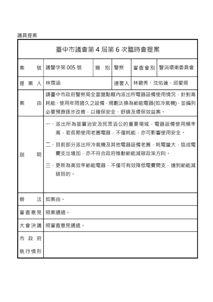 愛珊在議會-提案📄請臺中市政府警察局全面盤點轄內派出所電器設備使用情況,針對高耗能、使用年限過久之設備,規劃汰換為節能電器(如冷氣機),並編列必要預算逐步改善,以確保安全、舒適及環保效益案。