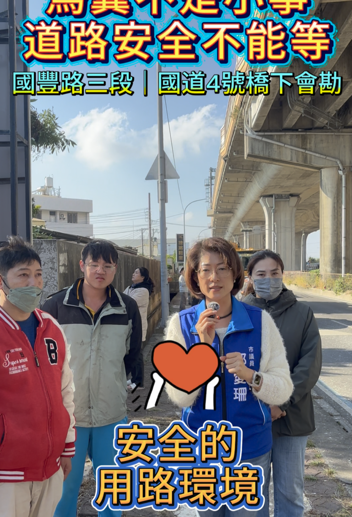 愛珊服務處接獲民眾反映,國豐路三段國道4號橋下,因野鳥長期棲息、鳥糞堆積,遇雨後路面濕滑,在日前造成多位機車騎士打滑受傷,已是明確的道路安全風險。